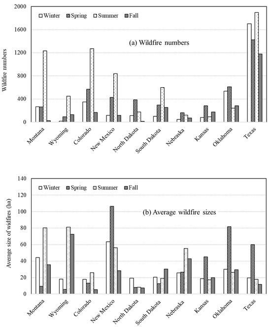 Seasonal wildfire patterns in the Great Plains vary geographically and are influenced by differences in land cover. In the western Great Plains, wildfire occurrences typically peak in summer, whereas in the eastern states, peak wildfire activity occurs in spring (Figure 9a). This contrast likely reflects differences in dominant vegetation types, woody vegetation in the west versus grasslands in the east. Yu et al. [6] identified a bimodal seasonal distribution of wildfires across the U.S., with a primary peak in August and a secondary peak in April, a pattern consistent with findings from this study. The summer wildfire peak is likely driven by convective storms and frequent lightning strikes [39]. In contrast, in grassland regions, the wildfire peak often occurs in spring before grasses become green, as dormant grasses are more flammable than actively growing grasses. Wildfire size also exhibits distinct seasonal patterns by region. In the southern Great Plains states (Texas, New Mexico, Oklahoma, and Kansas), wildfires are the largest in spring, about 1 to 2 times larger than in other seasons (Figure 9b). In contrast, northern states such as Wyoming and Montana wildfire sizes peak in summer. Notably, in Oklahoma and Kansas, both wildfire numbers and sizes peak in spring, indicating that wildfire risk is the highest during that season. In Texas, while most wildfires occur in summer, the largest total area burned is recorded in spring.