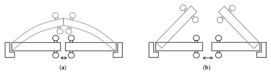 During fire resistance testing of fire doors according to ISO 3008-1 [2], the internal temperature of the heating furnace rises to 945 °C at the 60 min mark. The door leaf, composed of steel plates and core material, expands horizontally due to heating, while bending deformation simultaneously occurs because of the temperature difference between the heated and unheated surfaces. Excessive curvature, especially at the center of the leaf, can compromise the door’s latch or closure mechanism, causing unintended opening, which is the primary cause of failure in fire resistance tests of double-leaf fire doors. However, as illustrated in Figure 1, if the initial gap between the door leaves is small relative to the door width, the leaves quickly come into contact upon expansion, effectively supporting each other to withstand greater bending deformation. Conversely, a larger initial gap means the door leaves, even if initially touching upon expansion, will separate easily and open with minimal deformation. Therefore, as described in Equation (1), the expansion length of the door leaves and the gap between them are directly related to the maximum critical deformation that the door can withstand without opening.