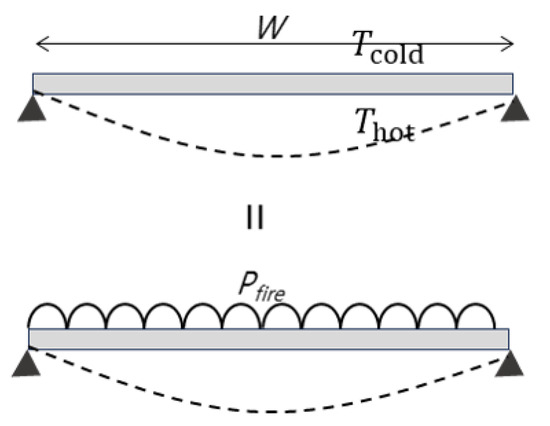 The deflection formula for a simply supported beam subjected to a uniformly distributed load is given by Equation (3). Where I is the moment of inertia and E is the elastic modulus. When these two models are combined, the load , based on the fire door specifications and the temperature difference between the heated and unheated surfaces, can be derived as shown in Equation (4).