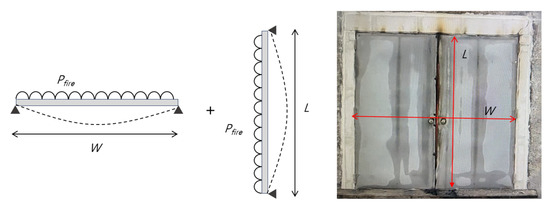 As shown in Figure 3, the deflection stiffness of a fire door is influenced by both its width (W) and height (L). The stiffness contribution from the width is formulated in Equation (5), while the contribution from the height—applicable to only one leaf—is given in Equation (6). Accordingly, the total deflection stiffness of a double-leaf door is expressed as the sum of both components, as shown in Equation (7), and the corresponding maximum deformation is derived in Equation (8).