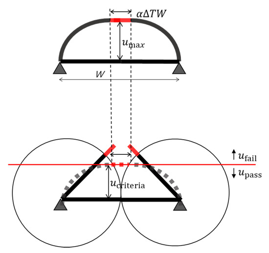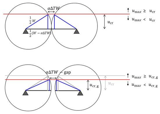 Figure 5 illustrates the critical deformation of double-leaf fire doors, considering the gap between two door leaves. In the upper diagram, where no gap exists, the maximum critical deformation is expressed as , which can be calculated using the Pythagorean theorem, as shown in Equation (11). However, for double-leaf fire doors with an existing gap, part of the door’s expansion is already used in closing the gap, resulting in a deformation that is less than the maximum possible. Similar to Equation (11), the maximum critical deformation considering the gap can be expressed as shown in Equation (12).