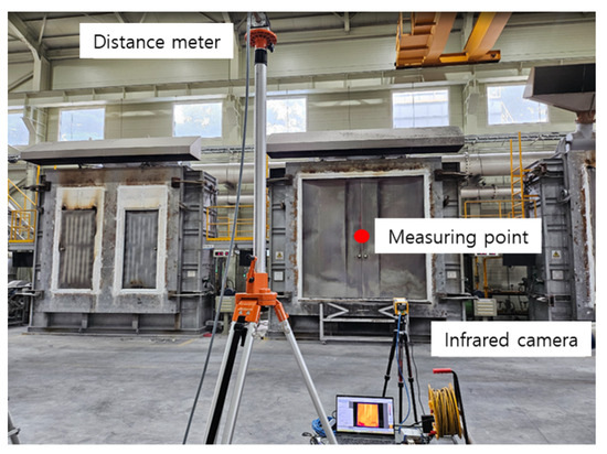 Figure 6 shows the fire resistance test setup for the non-insulated specimen. The specimen was installed within a single frame, and the remaining opening was sealed using ALC blocks. After installation, the specimens were placed in a furnace for testing. They were exposed to fire following a standard heating curve. Temperatures on the fire-exposed side were measured using thermocouples specified in the fire test standard [1], while temperatures on the unexposed surface were measured using a thermal imaging camera. The fire resistance test was carried out for a total duration of 60 min, and deformation at the center of the specimens was measured at 5 min intervals using a laser distance meter.