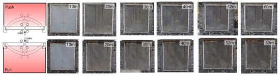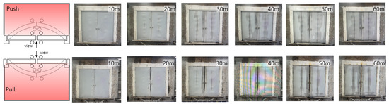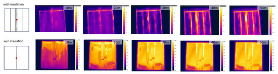 Figure 9 displays time-sequential photographs of the non-exposed surface for the specimen without insulation. As with Figure 7, tests were conducted in both the pulling and pushing directions, and photographs of the non-exposed surface were taken at 10 min intervals. Unlike the specimen with insulation, the discoloration of the door leaf on the non-exposed surface was already complete by the 20 min mark. Although continuous deformation occurred thereafter, the door did not open, and the specimen maintained its fire resistance performance for 60 min. Figure 10 shows the temperature distribution on the non-exposed surface measured using a thermal imaging camera. It shows different distributions over time depending on the characteristics of the specimen.