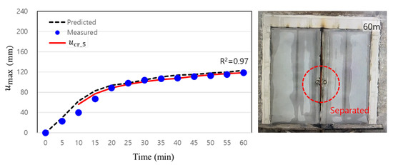 Figure 8 shows the amount of deformation that occurred during the fire resistance test for the specimen with insulation. The deformation was measured at the center of the door leaf, as seen in Figure 6, using a laser distance meter at 5 min intervals. These measurement values are represented by blue dots. The black dashed line represents the predicted values obtained using the thermal deformation model for a double-sash fire door derived from Equation (10). When comparing the predicted and measured values using the Pearson correlation coefficient, which indicates the degree of correlation between the two variables, an excellent correlation of 0.97 was obtained. However, the measured and predicted values at 10 and 15 min show some differences, which are believed to be due to the vertical reinforcement applied to the test specimen. In the early stage of the fire resistance test, before the reinforcing bar became sufficiently hot, it maintained its modulus of elasticity and provided appropriate rigidity to the system; however, after 20 min, the overheated reinforcing bar appears to have lost its functionality. This trend is also evident in Figure 7, where discoloration of the vertical reinforcement is observed starting from 20 min. Since the prediction model does not reflect the presence of the reinforcing bar, it shows higher values than the measured ones during the early stage; however, after 20 min, it accurately predicts the deformation.