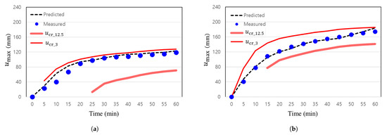 Figure 12 shows the predicted and measured values for the specimens with and without insulation examined earlier, and it presents the criteria for deformation for both a 12.5 mm and a 3 mm gap. This is based on the minimum gap of 3 mm specified in NFPA80 and the maximum gap of 12.5 mm observed in previous case studies [15]. Although the measured values should not exceed the performance criterion curve, both specimens show values that exceed it at a 12.5 mm gap. However, at a 3 mm gap, the measured values for both specimens remain below the threshold, suggesting that their fire resistance performance is not compromised. This finding contrasts with the 5 mm gap result observed in the specimen with insulation in Figure 8. In other words, for an insulated door with dimensions of 2400 2400 50, it can be proposed that a 3 mm gap is optimal for ensuring fire resistance performance. As for non-insulated doors, although the measured values indicate that a 5 mm gap might also be acceptable, the comparison using predicted values suggests that a 3 mm gap should be considered the appropriate clearance.