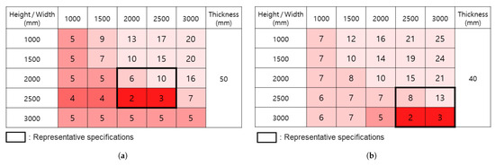 For insulated doors, the representative sizes fall between 2000 mm and 2500 mm, as indicated by the thick box lines. In most cases, applying the gap sizes specified by NFPA80 [16] does not cause significant issues. However, for the representative fire door sizes of 2000 mm × 2500 mm and 2500 mm × 2500 mm, the gaps that maintain fire resistance performance are suggested as 2 mm and 3 mm, respectively. For non-insulated doors, the representative sizes are those between 2500 mm and 3000 mm, also marked by the thick box lines. Similar to insulated doors, fire doors sized 2500 mm × 3000 mm and 3000 mm × 3000 mm should be managed with maximum gaps of 2 mm and 3 mm, respectively. This indicates that while the gap specifications required by NFPA80 [16] provide appropriate gap sizes, applying them uniformly across all sizes and performance standards may risk compromising the fire resistance capability.