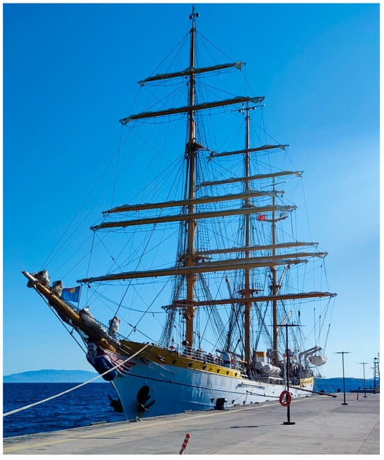 The research was carried out on a sailing ship constructed for training cadet students. The training ship, shown in Figure 1, with general characteristics listed in Table 1, is a class A sailing ship where propulsion is achieved using a classical diesel engine system. Additionally, the vessel can navigate using wind power, as it is equipped with 23 sails that add up to a total sail area of 1850 m2. This feature enables it to operate as a hybrid system, combining diesel engine propulsion with wind-powered sailing, enhancing its versatility and energy efficiency. The ship’s mechanical propulsion system is a classic type with a single shaft line and comprises a four-stroke MAK main engine, a gearbox, a shaft line, and a controllable pitch propeller. In addition, the ship is also equipped with 3 MAN diesel generators for producing electricity on board.