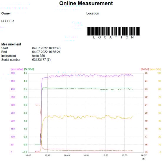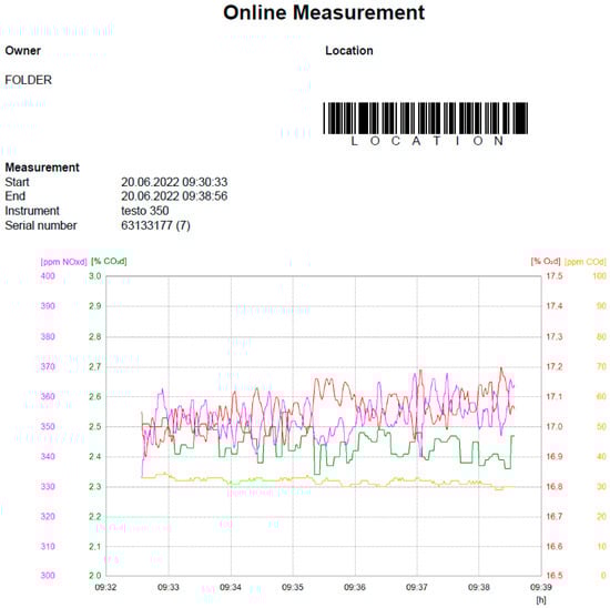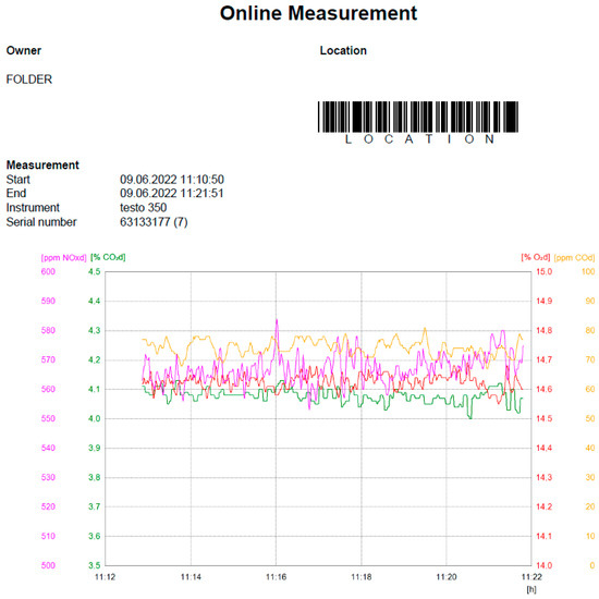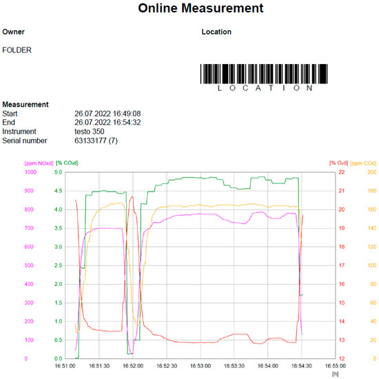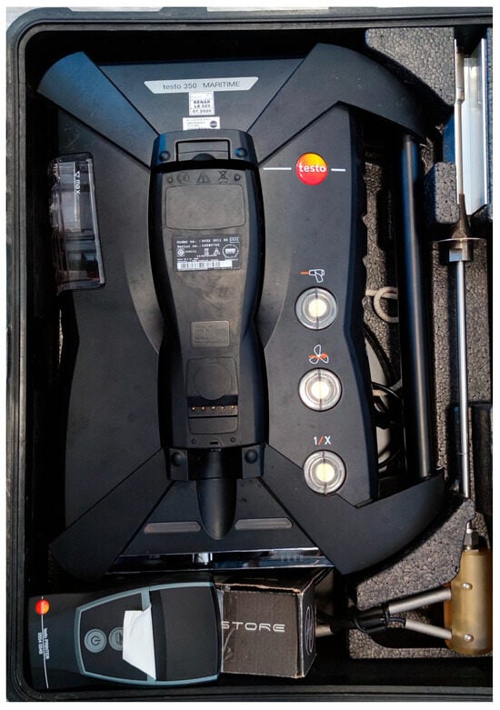 The gas emissions measurements were carried out on the exhaust gas systems of the engines during a voyage in the Mediterranean Sea from June to August 2022. The measurements were determined using the TESTO 350 MARITIME gas and emission analyzer shown in Figure 4. The device can be used to measure exhaust gas concentrations of NO, NO2, SO2, CO, CO2-(IR), and O2.