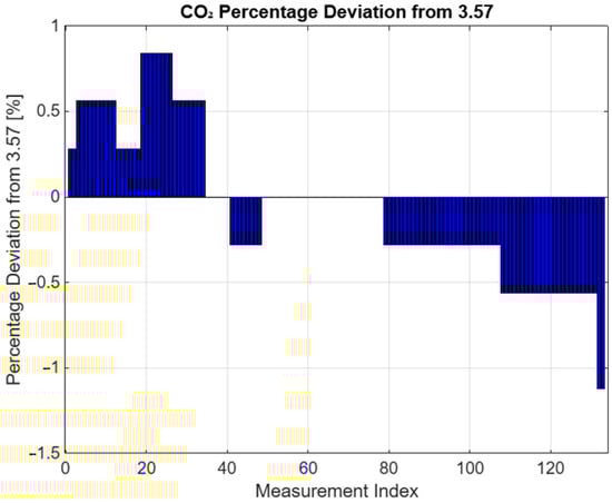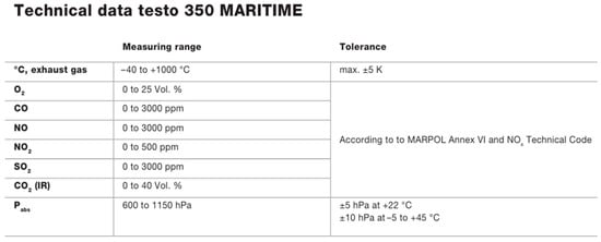 The measurement accuracy and range of the sensors are specified in Figure 5 and MARPOL annex VI and the NOx technical code [9]. The device consists of a control unit, a measuring probe, a memory unit, and a printer. The analyzer’s readings must not exceed ±2% of the measured value across the full measurement range (except zero) or ±0.3% of full scale, whichever is greater [9]. If a full CO2 scale of 40% is taken, this means that the accuracy is 0.12% [9]. Because 0.12% is too low and irrelevant, it will be taken to 2% accuracy.