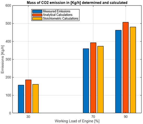 The measured values for the main engine at a maximum load of 90%, such as maximum 461.7545 kg CO2/h, were lower than those calculated by theoretical methods (stoichiometric and analytical) with maximum 479.9277 kg CO2/h and 506.3418 kg CO2/h, as shown in Table 12, highlighting that idealized approaches did not fully reflect the complexity of the combustion process in reality. To better understand the differences in values, these have been converted into percentages.
