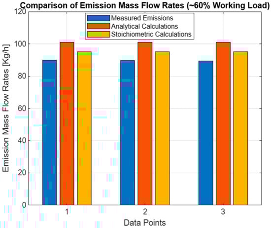 In addition, considering the differences in values between the stoichiometric calculation and analytical calculation (the differences of 13.29%, 4.87%, and 5.21% for main engine loads of 30%, 70%, and 90%, respectively), it can be concluded that the stoichiometric calculation values are lower than the analytical ones. The observed discrepancy may be attributed to the inherent simplifications within stoichiometric models.