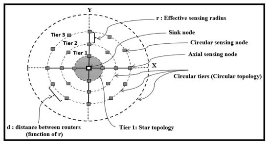 - A novel hybrid star/circular WSN topology optimized for remote forest environments, reducing node deployment by 53–55% compared to conventional Mesh 2D topologies while ensuring robust coverage through concentric tiered arrangements adaptable to flat or mountainous terrain.