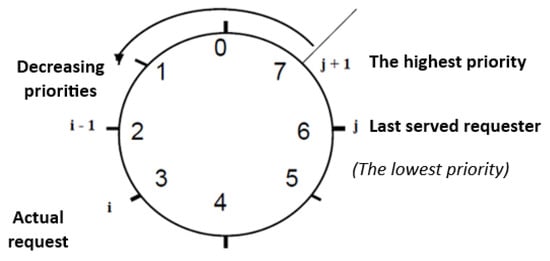 | Input: X [0…n − 1]: Array of request signals (1 = active, 0 = inactive) P [0…n − 1]: Priority list (round-robin) N: Rank register n: Total number of requesters Output: Z [0…n − 1]: Grant signals Wait until any X(i) = 1 for i = 0 to n − 1 status ← X [0…n − 1] //Identify active requests Nb ← CalculateRequesterNumber (status) //Count number of active requests if Nb ≥ 1 then i ← SelectRequester (status, P) //Choose the highest priority requester Z(i) ← 1 // Grant access Wait until X(i) = 0 //Wait for requester to finish Z(i) ← 0 // Revoke access j ← FetchPriorityOrder (P, i) //Get position of granted requester P ← Concatenate (P [j + 1…n − 1], P [0…j − 1], P[j]) //Update round-robin priority end if |