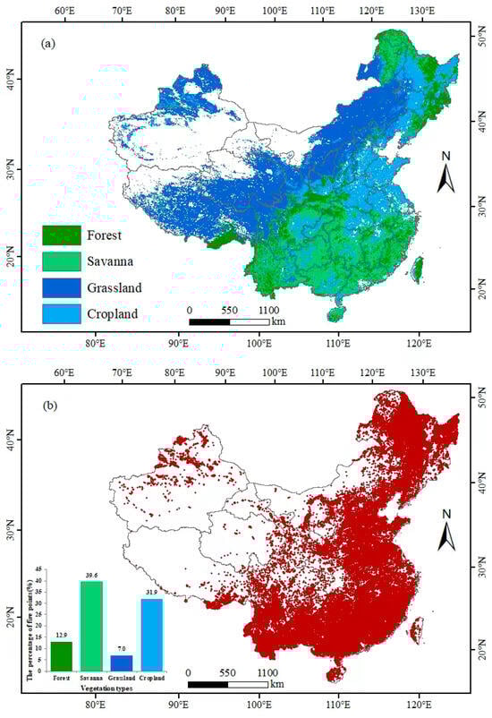 China is an extensive country with a diverse range of geography, climates, and ecosystems. From the temperate monsoon climate in the northeast to the subtropical monsoon climate in the south, and the arid and cold climate in the west, there are significant geographical and climatic differences, which directly influence the spatiotemporal distribution of fires and their occurrence mechanisms. Different vegetation types, such as forest, grassland, desert and cropland, are distributed throughout the country [] (Figure 1a), with forest fires occurring mainly in the northeast and southwest, grassland fires in Inner Mongolia and Xinjiang, cropland fires in the North China Plain, and fewer fires in the arid regions of the west [] (Figure 1b).
