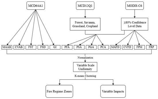 The MCD64A1 burned area product and the MODIS C6 active fire product were used as national fire data sources, and the MCD12Q1 land cover data were used to distinguish fire types, to explore the spatial distribution characteristics of fires across China from 2001 to 2023, to carry out zoning and to establish FR. The workflow diagram of this study is shown in Figure 2.