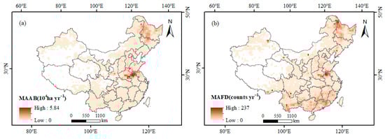 Occurrence of fires. (a) Mean annual area burned, which indicates the average area burned by fires in the region each year, with darker colors representing a larger burned area in the region. (b) Mean annual active fire density, which indicates the frequency of fires per unit area per year, with darker colors representing more frequent fire activity.