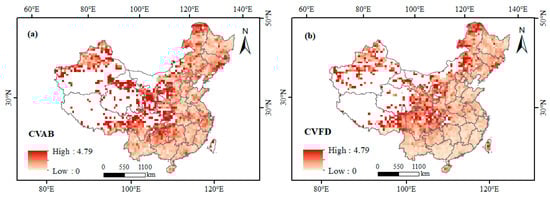 Inter-annual variability of fires. (a) Inter-annual CoV in annual area burned, which indicates the degree of change in burned area between years, with darker colors representing greater inter-annual variability. (b) Inter-annual CoV in annual active fire density, which indicates the degree of change in active fire density between years, with darker colors representing more significant inter-annual variability.