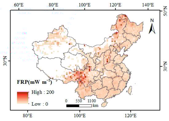 The distribution of fire radiant power shows obvious geographical differences, with the Greater Khingan Mountains and Lesser Khingan Mountains in the northeast and the Hengduan Mountains region in the southwest having higher fire radiant power close to 200 mW m−2 due to the extensive coverage of forests and grasslands, and the east-central region having lower fire radiant power, averaging 90 mW m−2 (Figure 6).