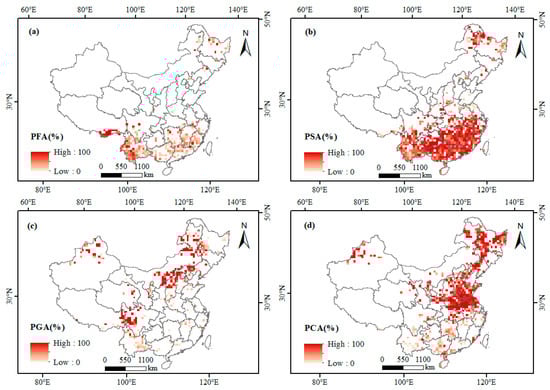 The spatial patterns of different ecosystems affected by fires are systematically analyzed in Figure 8. In forest ecosystems (Figure 8a), the percentage of forests affected by fires in the southern tropical monsoon rainforest zone (southern Yunnan and southwestern Guangxi) reached 68–92%, which was significantly higher than that of the temperate mixed coniferous forest zone in the northeastern part of the country (35–58%). In savanna ecosystems (Figure 8b), the percentage of fire-impacted savanna in the southern part of the country was as high as 87–100%; values in the savanna zone of the Northeast China Plain were only 12–29%. In grassland ecosystems (Figure 8c), the percentage of grassland affected by fires in the Hengduan Mountains amounted to 74–89%; the values in the typical grassland areas of Inner Mongolia showed an east-west gradient difference, with the east (62–78%) being significantly higher than the west (34–49%). In cropland ecosystems (Figure 8d), the percentage of cropland affected by fires in the black soil region of northeast China amounted to 55–83%; the percentage of cropland affected by fires in the cropland in the North China Plain amounted to 71–89%, which is consistent with the spatial distribution of slash-and-burn agricultural traditions.