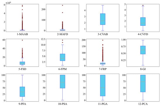 Box-plot distribution of fire variables. The bottom and top edges of the blue box indicate the 25th percentile and 75th percentile values, respectively; the red markers in the box indicate the median; outliers are indicated by red dots; and the small blue horizontal line markers indicate the maximum and minimum values of the data points.