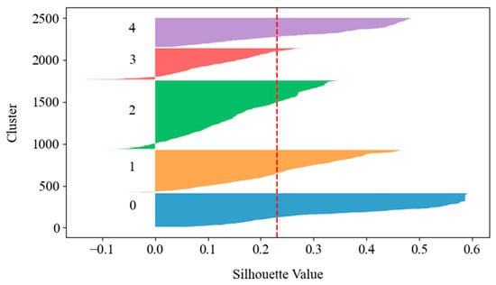The value of the silhouette coefficient with cluster number 5. Each horizontal line represents the distribution of a cluster, the horizontal axis represents the value of the profile coefficient, the vertical axis represents the different cluster numbers, the width of each horizontal line represents the number of samples in that cluster, and the red dashed line represents the mean value of the profile coefficient.