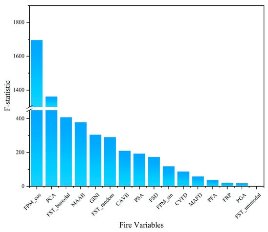 In order to investigate the influence of various variables on the clustering results, we employed a multifactor analysis of variance to assess whether there were significant differences in the means of each variable across the five zones. If a variable exhibits substantial mean differences across zones, it indicates that the variable contributes significantly to distinguishing between the zones. From the results of the analysis (Figure 12), it can be seen that the factors that are more important for zoning include fire peak month, percentage of croplands affected by fire, fire season type, mean annual area burned and Gini index. The F-statistics of FPM and PCA are significantly higher than those of the other factors. As shown in Table 3, the values of FPM vary across the five zones, resulting in a large inter-class difference. This observation is further confirmed by Figure 5b and Figure 8d, which also indicate a relatively consistent intra-class variation. The relatively high F-values of MAAB and GINI can be attributed to the extensive burned areas and the high prevalence of unstable fire events in regions predominantly located in FR1 and FR2. This results in higher MAAB and GINI values for these two regions compared to others, leading to substantial inter-class differences. The FST of the bimodal pattern ranks third, as the clustering analysis in this study revealed that FR3, FR4, and FR5 did not clearly exhibit peak-type patterns. This is because the fire in these regions is rare and random, and difficult to extract, leading to a temporal distribution of fire that does not follow the typical unimodal or bimodal pattern [,]. Moreover, as shown in Figure 5c, the bimodal pattern is predominantly distributed in FR1, leading to a higher F-statistic value. This further demonstrates that the FST has a significant impact on the clustering outcomes.