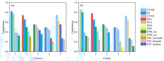 Factor contribution in each cluster. (a) Thirteen factors, including FST. (b) Twelve factors excluding FST. Both figures show only the top five factors with the highest contribution within each class.