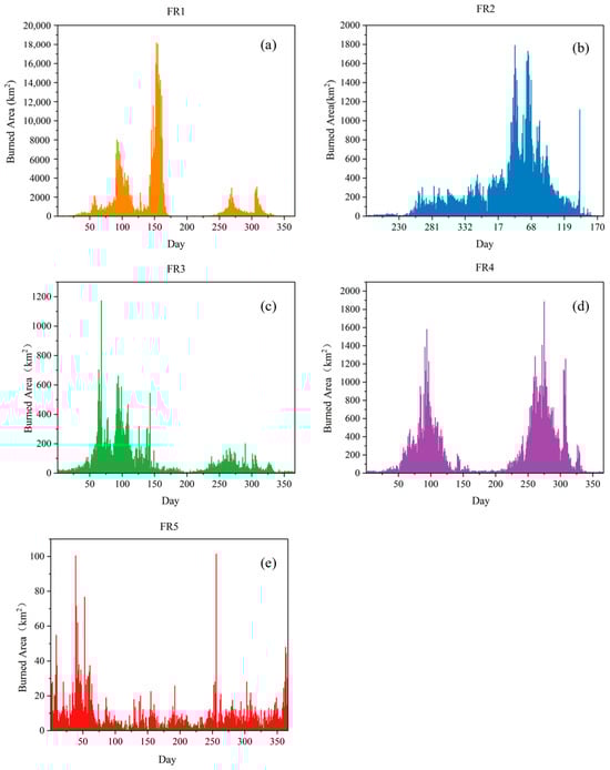 FR 4: In parts of the central and northeast regions, the characteristics of forest fires are more obvious. These areas generally have higher fire intensity (FRP = 17.7 mW m−2) and larger single burn areas (MAAB = 103 ha yr−1), but the frequency of fires is relatively low. In terms of timing, the peak of fires occurs in October of each year.