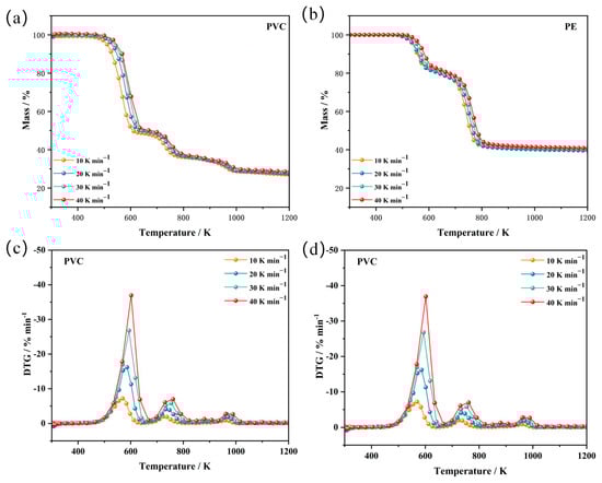 TG (a,b) and DTG (c,d) curves of flame-retardant PVC and PE insulation at various heating rates.