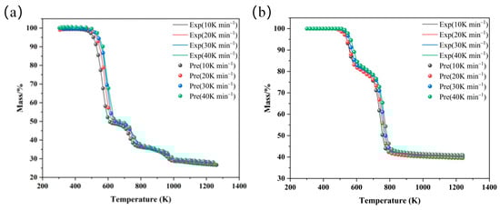 Figure 6 presents the comparison between experimental data and CART model predictions for the mass loss curves of flame-retardant PVC and PE. The experiments were conducted at heating rates of 10, 20, 30, and 40 K/min, and the CART model demonstrated excellent agreement with the experimental data, achieving determination coefficients (R2) of 0.995 for PVC and 0.988 for PE. These results highlight the model’s high reliability and precision in describing the pyrolysis process of these materials. As shown in Figure 6a, the CART model accurately predicts the mass loss characteristics of flame-retardant PVC during pyrolysis, particularly during the HCl elimination and main-chain scission stages. Similarly, Figure 6b demonstrates the model’s high accuracy in predicting the pyrolysis of flame-retardant PE, effectively capturing the stages of branch decomposition and main-chain cracking. These findings validate the CART model’s adaptability and robustness in characterizing complex pyrolysis behaviors.
