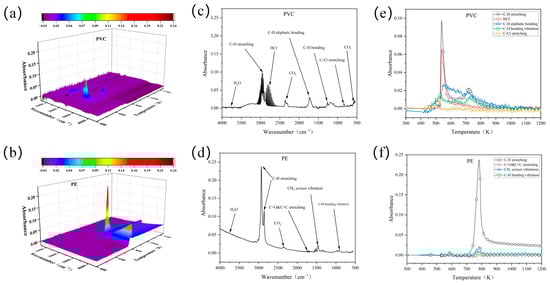 Infrared characteristics of pyrolysis gases from flame-retardant PVC and PE: (a,b) 3D infrared spectra; (c,d) gas characteristic peaks; (e,f) temperature-dependent absorption peak intensities.