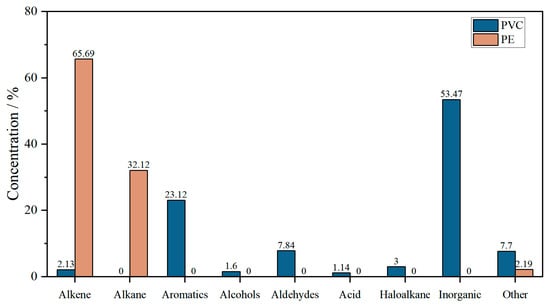 Figure 9 provides a comparative analysis of the major chemical components in the pyrolysis products of flame-retardant PVC and PE, highlighting distinct differences in their decomposition behaviors. Flame-retardant PVC primarily generates inorganic compounds and aromatic hydrocarbons, whereas flame-retardant PE predominantly produces alkenes and alkanes.