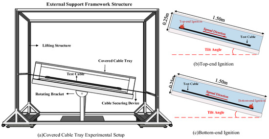 The main structure of the experimental setup was a covered cable tray, which was designed based on the actual covered cable trays used in engineering applications and reproduced at full scale. The experimental setup was open at the two extremities. Three sides of the tray were made of metal materials commonly used in engineering, while one side was made of cesium–potassium fire-resistant glass to facilitate the collection of flame image data during combustion. The cross-sectional dimensions of the tray were 40 × 25 cm (internal space dimensions), and the length of the cable tray was 150 cm. The cables were arranged in a single row and closely packed within the tray, with a total of four cables used. The cable used in this experiment was an aluminum-core cross-linked polyethylene-insulated power cable, model number YJLY 3 × 25. It was a cross-linked polyethylene (XLPE)-insulated, polyethylene-sheathed power cable, with a rated voltage of 0.6/1 kV. The core material of the cable was aluminum, with a wire core diameter of 25 mm. The thickness of the sheath layer was 1.8 mm. These cables were straightened using a tensioning clamp and then laid flat in the cable tray. This experimental scenario considered different tilt angles and ignition positions. The varying tilt angles simulated non-horizontal cable tray installations in real applications, while different ignition positions could affect the combustion behavior. Two ignition positions were designed in this experiment: top-end ignition and bottom-end ignition. In this experiment, a flame torch was used for ignition. Due to the influence of different ignition positions and tilt angles, the time required to ignite the cable varied. Therefore, the ignition time was determined based on the appearance of the flame on the cable. The specific experimental conditions are detailed in Table 1.