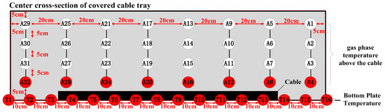 The experiment utilized Type K thermocouples. Several thermocouple holes were drilled on the side panel of the covered cable tray for the installation of fixed thermocouples. The arrangement of the thermocouples is detailed in Figure 2. When the tilt angle of the cable tray was adjusted, the corresponding thermocouple measurement points also followed the tilt.