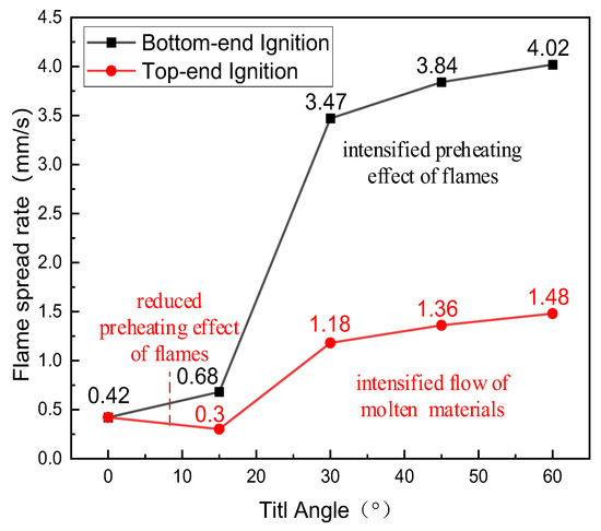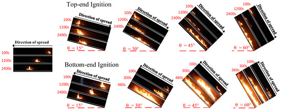 Figure 8 presents the average fire spread rate curves for cable combustion in a covered cable tray. The results showed that there were significant differences in the fire spread rates between top-end and bottom-end ignition under different tilt angles. Due to the inclination, under the condition of top-end ignition, the flame size was relatively small and tilted. As a result, the thermocouples at the front of the combustion could not reach the specified threshold temperature, even though the flame continued to spread. Therefore, image and video data were chosen to determine the rate of fire spread. When the flame front reached a certain position, it was considered that the fire had spread to that location. Using video processing software, the video data were output as images at fixed time intervals (typically according to the video frame rate). By recording the flame positions, the average fire spread rate for the cable section could be calculated.