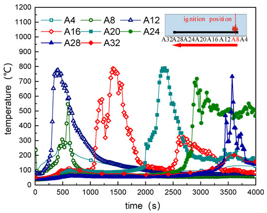 The series of temperature curves for cable combustion in a covered cable tray under horizontal laying conditions are shown in Figure 4. In this figure, curve A8 represents the temperature near the ignition point, while curve A32 represents the temperature near the end of the combustion zone.