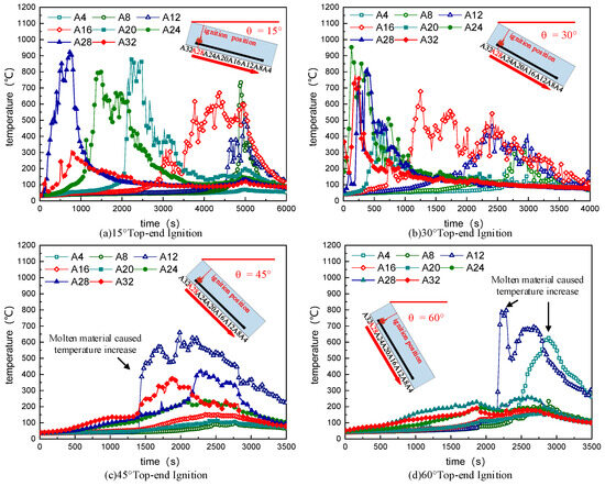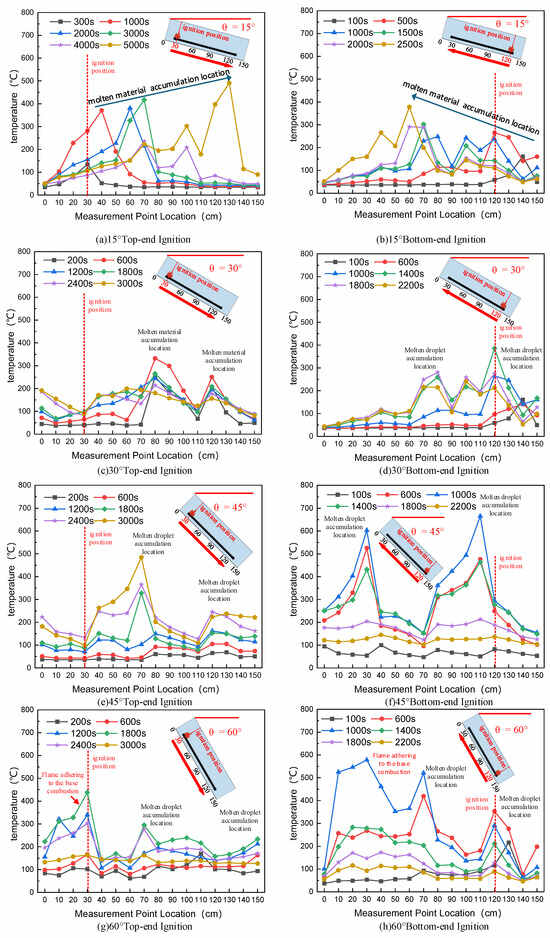 The molten material had a significant impact on the combustion behavior of cables under different tilts. To further analyze the effect of tilt angles on molten material, Figure 7 presents the temperature curves of molten material under different tilt angles. The data measurement points were the T1–T16 points in Figure 2, which collected the temperature of the central cross-sectional floor of the cable tray. Comparing vertically across different tilt angles, it could be observed that as the tilt angle increased, the location where molten material accumulated became more concentrated. This was because the increase in tilt angle accelerated the flow of molten material, preventing it from dripping vertically and instead causing it to flow and accumulate at the lower end.