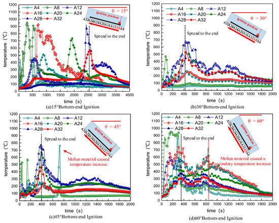 The series of temperature curves for cables in a covered cable tray with four different tilt angles under bottom-end ignition are shown in Figure 6a–d. They provide the temperature curves for tilt angles of 15°, 30°, 45°, and 60°, respectively. Curve A8 represents the temperature near the ignition point, while curve A32 represents the temperature near the end of the combustion zone.