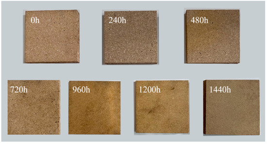 Nonetheless, flame-retardant panels subjected to natural conditions for extended durations frequently undergo performance deterioration. A 60-month natural weathering test indicates that the flame-retardant efficacy of water-soluble flame-retardant wood markedly diminishes within 3 to 12 months [5]. The heat release during the burning of aged wood increases by more than 30% [6], suggesting that external conditions (temperature [7], humidity [8], and light [9]) significantly contribute to the deterioration of the material’s physicochemical structure, hence impairing flame-retardant ability.