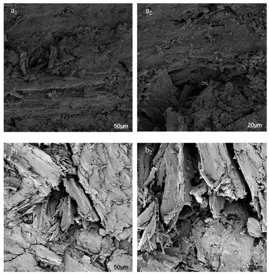 Comparative SEM micrographs of MFPB surfaces before and after thermo-oxidative aging: (a1) pristine sample at 200×; (a2) pristine sample at 500×. (b1) aged 1440 h samples by thermo-oxidative aging at 200×; (b2) aged 1440 h samples by thermo-oxidative aging at 500×.