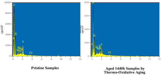 Comparative EDS spectra of MFPB surfaces before and after thermo-oxidative aging.