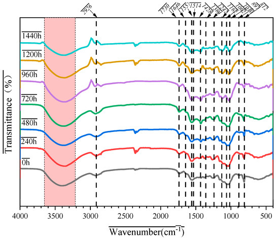 FTIR spectroscopy can identify the characteristic functional groups of plant fibers qualitatively and MFR in MFPBs and analyze the destructive effects of thermo-oxidative aging on their chemical structure. Figure 4 shows the FTIR spectra of MFPBs under different thermo-oxidative aging times. Table 3 presents the assignments of the prominent absorption peaks of MFPBs.