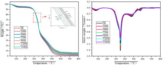 TG and DTG profiles of MFPB samples subjected to varied thermo-oxidative aging durations.