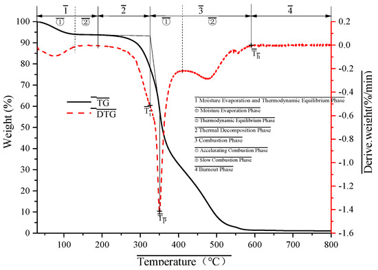 Figure 5 displays the TG and DTG curves of MFPBs subjected to various thermo-oxidative aging durations, while Figure 6 systematically illustrates the corresponding combustion phase divisions and characteristic temperature positions. As outlined in Figure 6, the combustion processes of the MFPB samples across different aging periods can be categorized into four distinct phases: (1) Moisture Evaporation and Thermodynamic Equilibrium Phase, (2) Thermal Decomposition Phase, (3) Combustion Phase, and (4) Burnout Phase. Key parameters, including phase-specific temperature ranges, mass loss rates, and predominant reaction processes, are thoroughly summarized in Table 4.