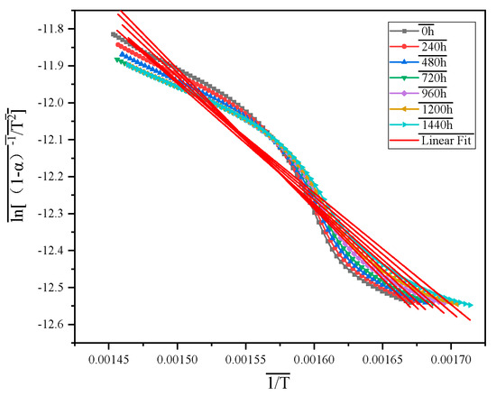 According to Ref. [33], the TG curves of the combustion stage of MFPBs with different thermo-oxidative aging times were fitted. This paper considers that the combustion stage of MFPBs in an air atmosphere conforms to the second-order reaction model, so is adopted. As seen in Figure 7, the fitting of this mechanism function shows linearity, indicating that the selection of is correct. The kinetic parameters of the combustion stage of MFPBs under different thermo-oxidative aging times calculated by the established model are shown in Table 6: