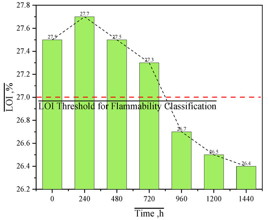 The LOI, a widely adopted quantitative method for evaluating flame-retardant performance, was employed to preliminarily assess the impact of thermo-oxidative aging durations on the flame retardancy of MFPBs. Figure 8 illustrates the LOI values of MFPBs under varying aging times.