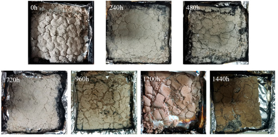 The experimental data (Figure 9 and Figure 10 and Table 8) show that with prolonged aging, the integrity of MFPBs combustion residues decreased, and crack density increased. The pristine sample retained a dense char layer; after 1440 h aging, the char layer disintegrated into loose ash.