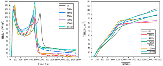 HRR and THR curves of MFPBs under varying thermo-oxidative aging durations.
