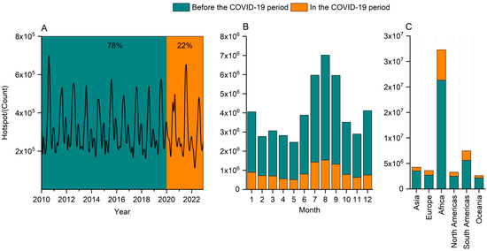 Annual global hotspot counts before and during the COVID-19 incidents from 2010 to 2022 (A), monthly distribution of hotspot proportions (B), and the distribution of hotspot counts across the seven continents globally (C).
