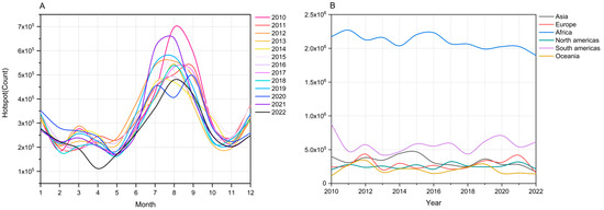 Monthly trends in hotspot counts before and during the COVID-19 incidents from 2010 to 2022 (A) and annual trends in hotspot counts across the seven continents globally from 2010 to 2022 (B).